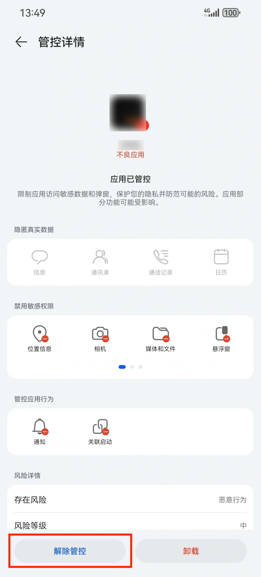 1.进入“手机管家” -> “病毒查杀” -> “风险/应用管控中心”,检查应用是否在风险项中